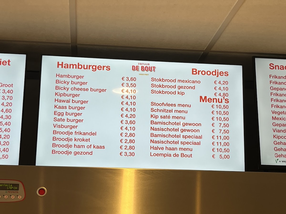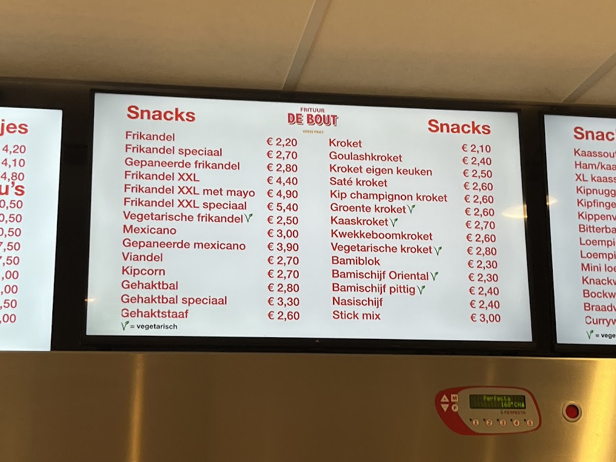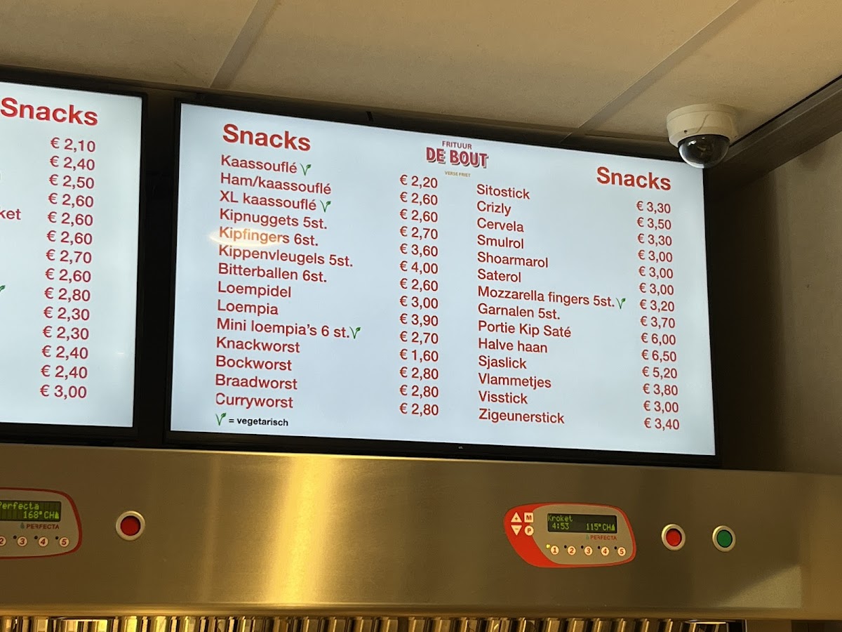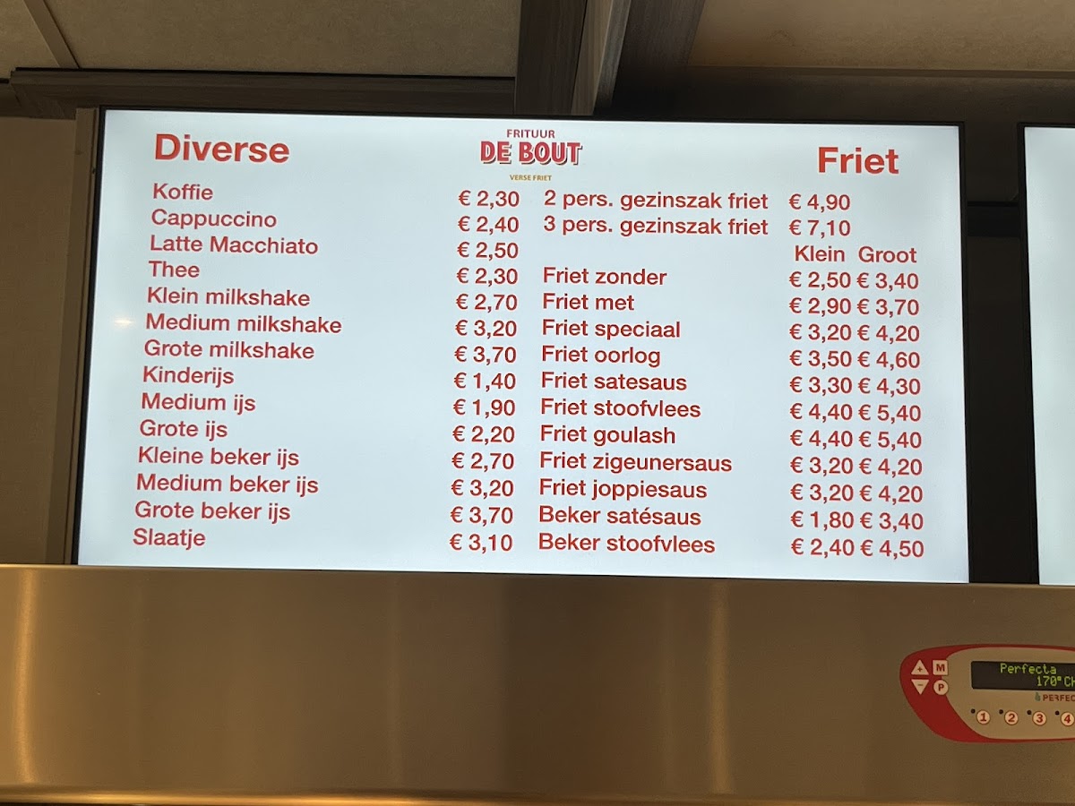 This menu structure supports both on-site casual dining and convenient takeaway, providing a range of fried foods, snacks, drinks, and light treats consistent with local frituur cuisine.