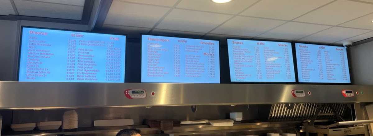The menu at this location primarily features typical cafeteria and fast food offerings, with a focus on fried snacks and traditional Dutch-style fries. It includes a variety of quick-service items suitable for casual dining or takeout. The food selection generally covers snacks and fried components commonly found in frituur establishments.